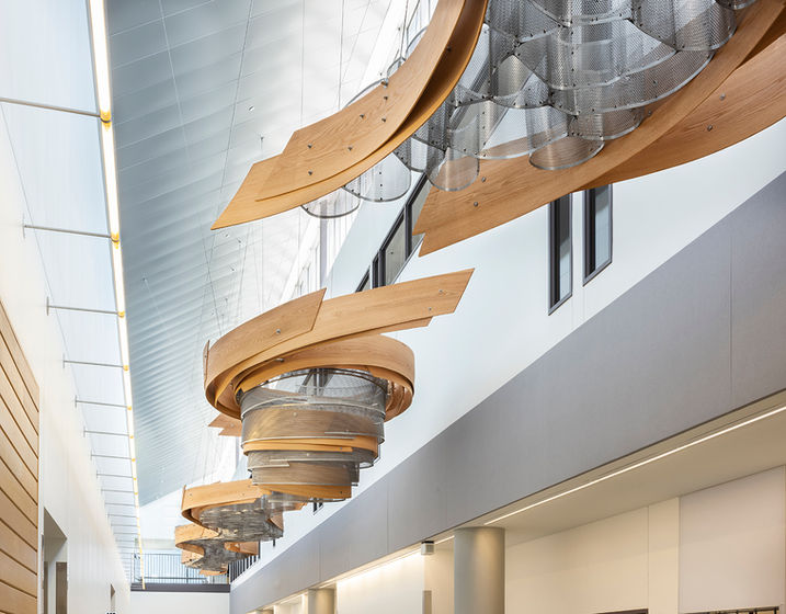 The piece is intended to provide both a wayfinder from the building’s entry doors into the heart of the building, as well as a metaphor for the goal of building community as individuals move temporally and spatially together through their lives and along their educational and career paths. As with the experience of education, Conveyor changes in perspective as it is seen from underneath on the first floor, along its expanse on the second-floor balconies at either end of the building, or through the vertical windows in the offices lining the second floor.