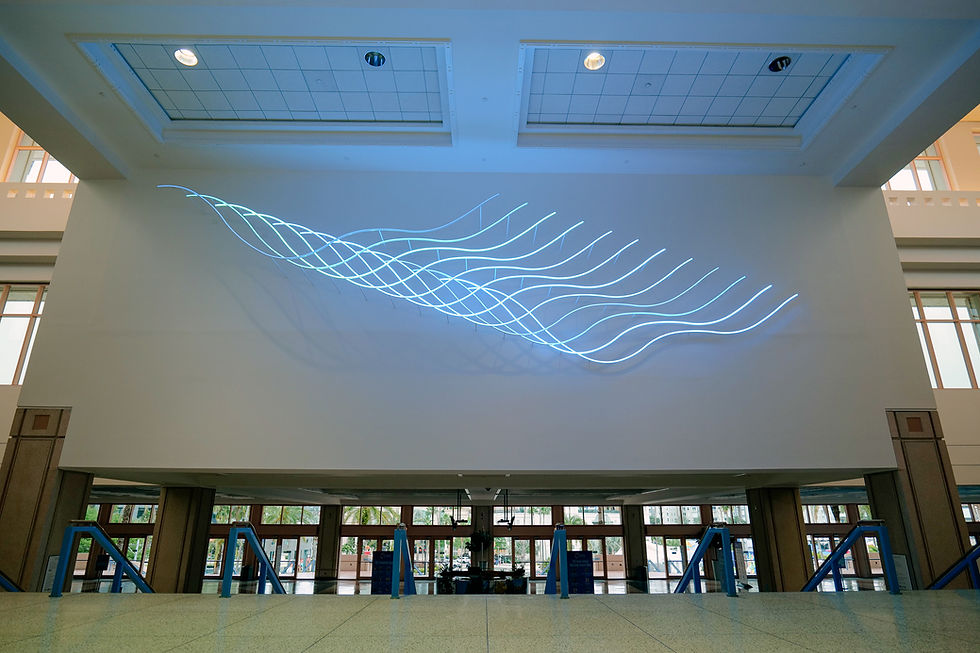 Tampa, like much of the Gulf Coast, has a diurnal tidal cycle and experiences one high and one low tide each lunar day. Using data from National Oceanic and Atmospheric Administration (NOAA), this dimensional wall sculpture interprets the Hillsborough Bay and Davis Island tidal pattern. The shape of the LED lines and changing colors visualize this diurnal tidal cycle where tides rise and fall along the lunar day. Recurrence brings the outside environment into the Convention Center, and much like the coastal city, represents the meeting point of the natural world and our built environment.